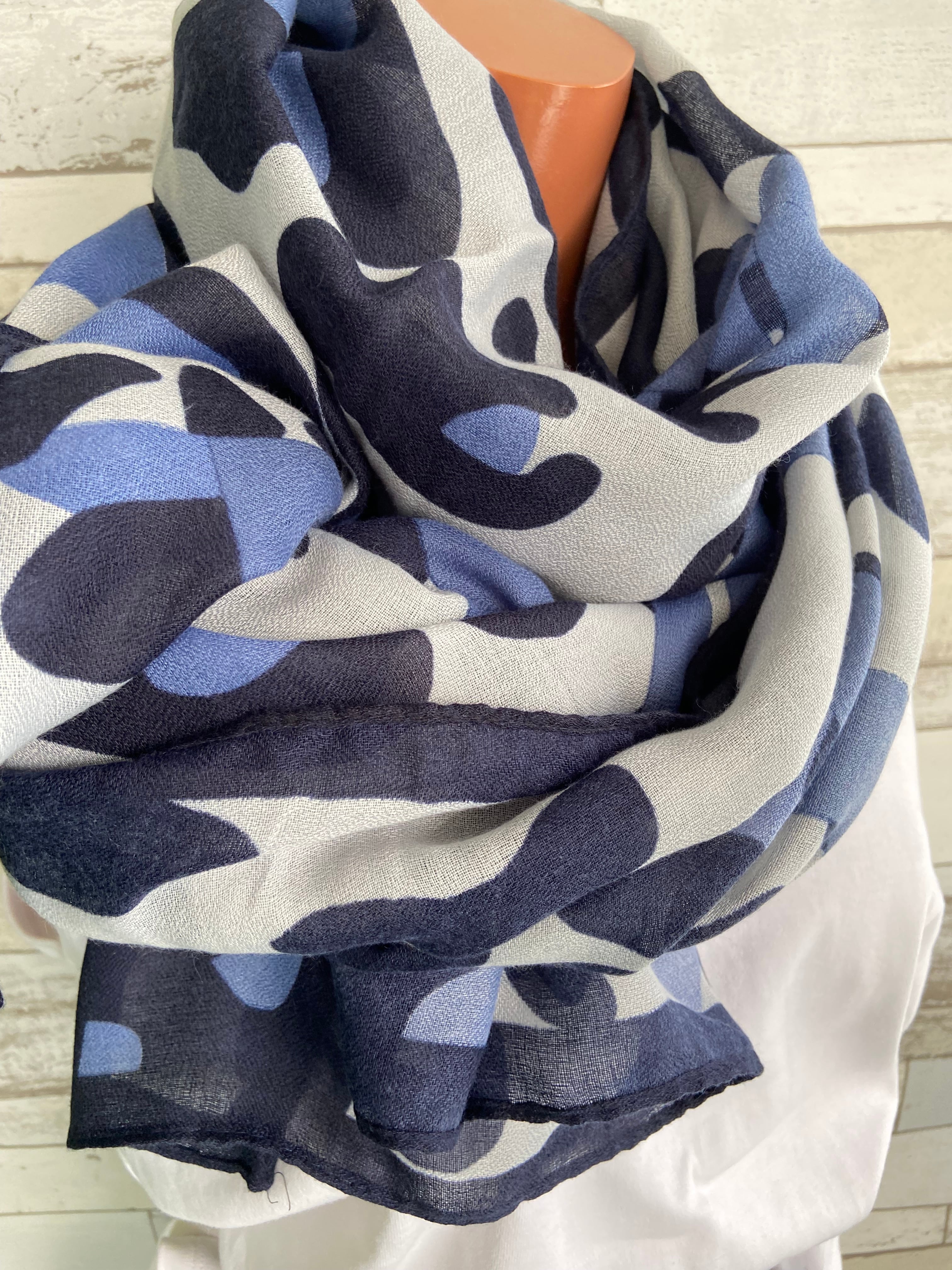 色のトーンがとてもオシャレで、カモフラっぽい柄に大きなリボンですが巻くとリボンは差し色の様になるかな。ストールの中では大判です。ビスコースはテカリなく肌触りが柔らかで心地いいですよ。