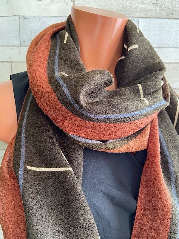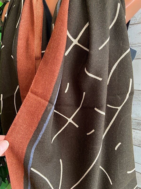 肌触りもよく、巻く位置によって色んな雰囲気を楽しめるのが面白いので1枚持ってると毎回違ったコーデが作れそうなステキなストールです。