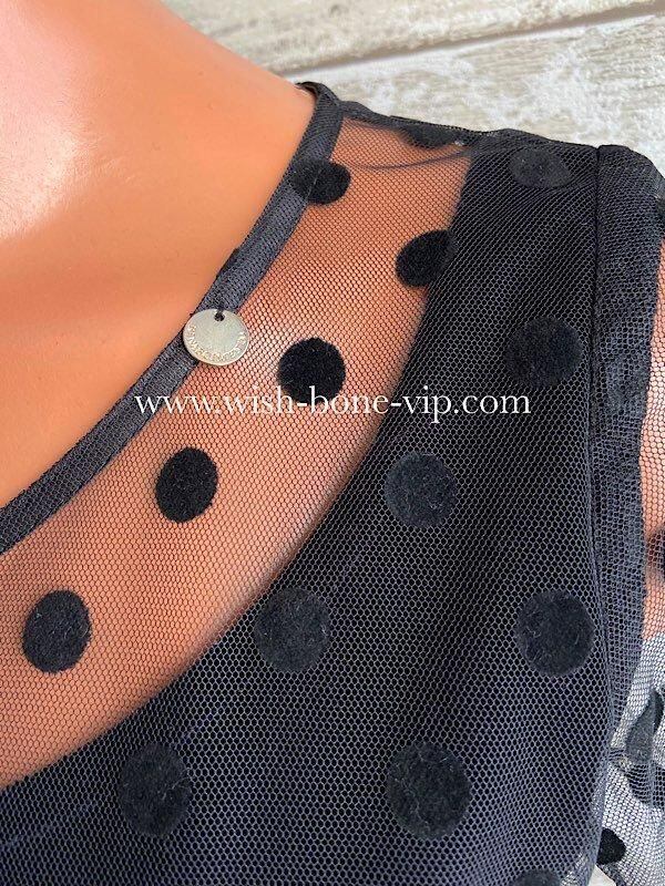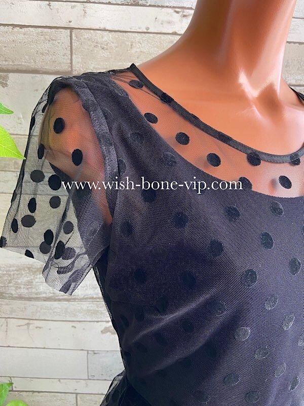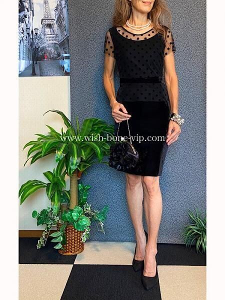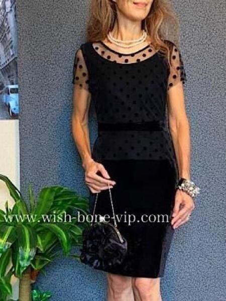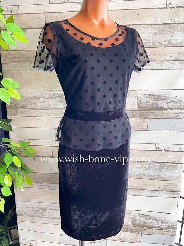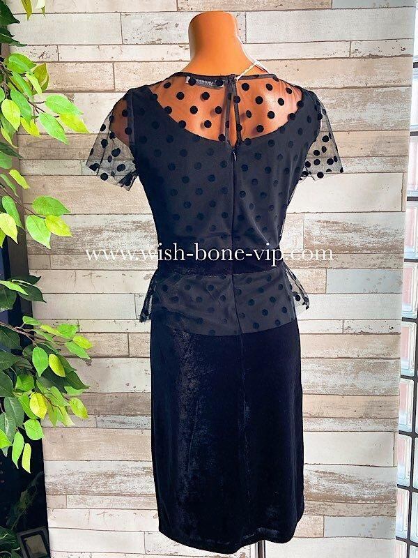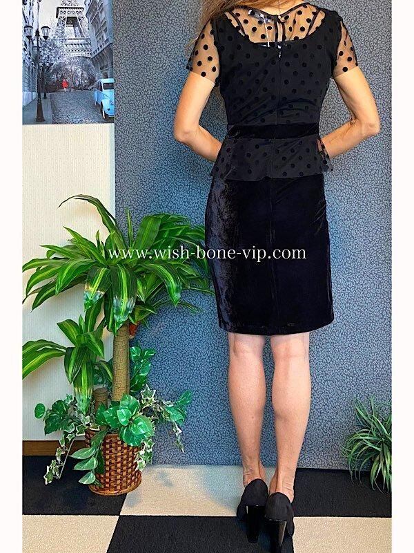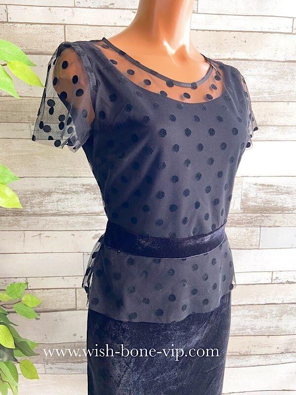 デコルテとお袖のチュール、シースルーに水玉ドットの透け感がとても珍しいドレスデザインのタイトワンピースです。こちらウエストもベロアで切り替えられたぺプラム。すごくオシャレです。パーティーや結婚式はもちろん、普段のお仕事にも着たくなるワンピースです。