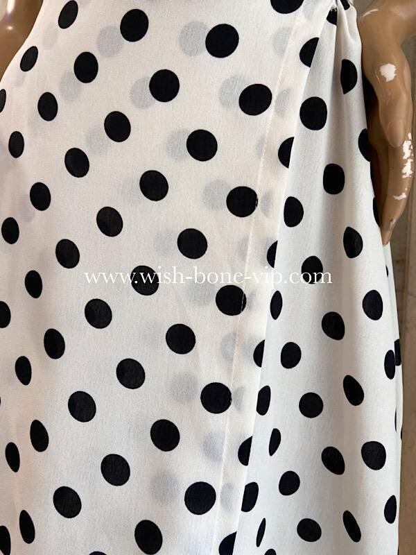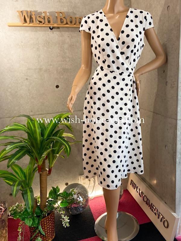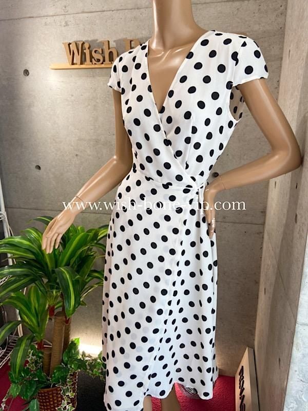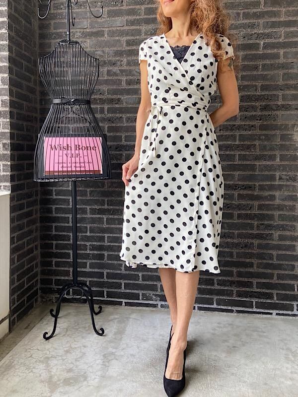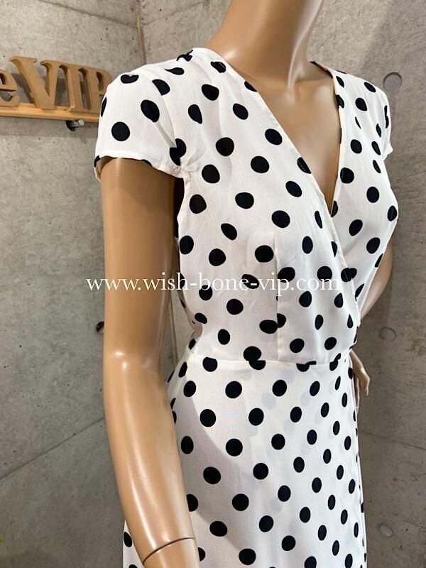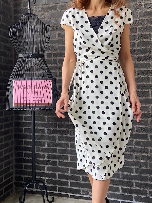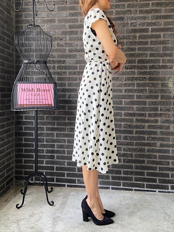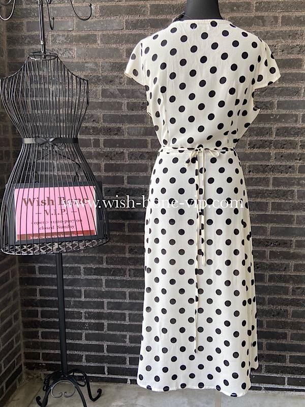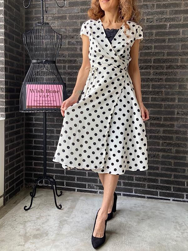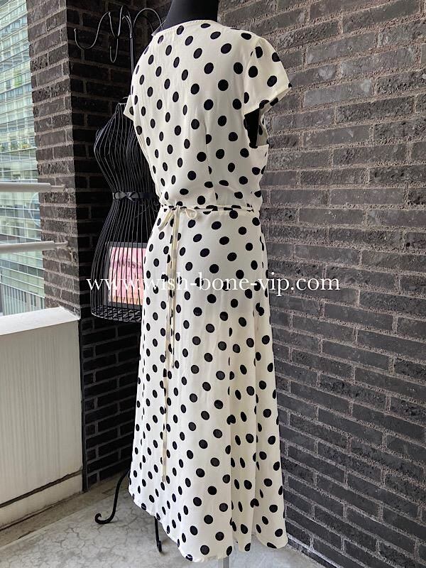 UK/ロンドンインポート ワンピース|完全ラップ巻き細リボン ミモレ丈ワンピース/ホワイト&ブラック水玉ドット(12)