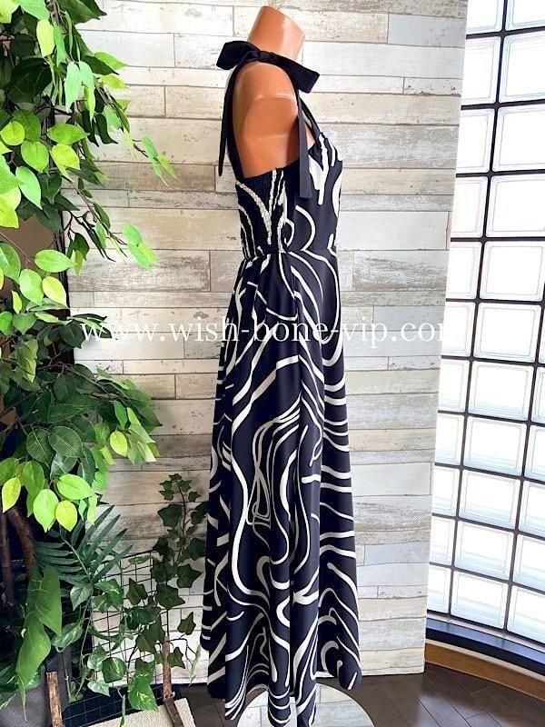 ブラック&ホワイトのウェーブプリントがカッコいいロング・マキシワンピースです。ベアトップはデコルテがスッキリと見えるので上からの羽織りものもしやすく何といってもエレガント!