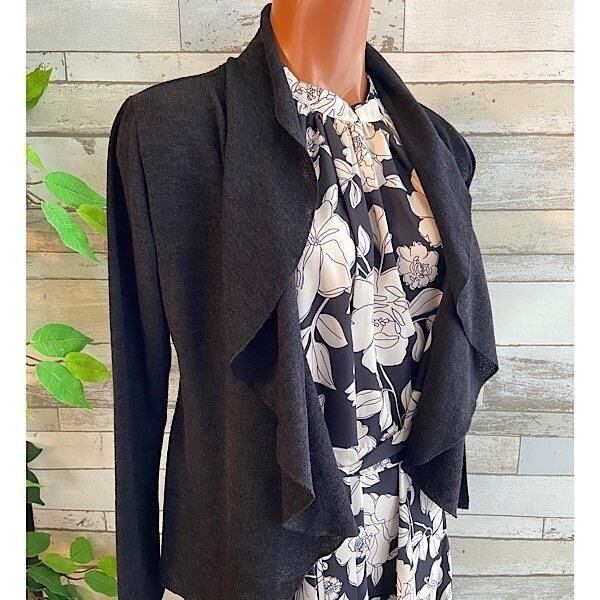 1枚あると、とても便利な、前がフリルのカーディガンです。背中の切り替えもあるのでウエストがしまって見えキレイですよ。荒めのニットですので軽く羽織るにちょうど良さそうなのもお勧めです。パンツなどにも相性の良いミディアムロングデザインです。