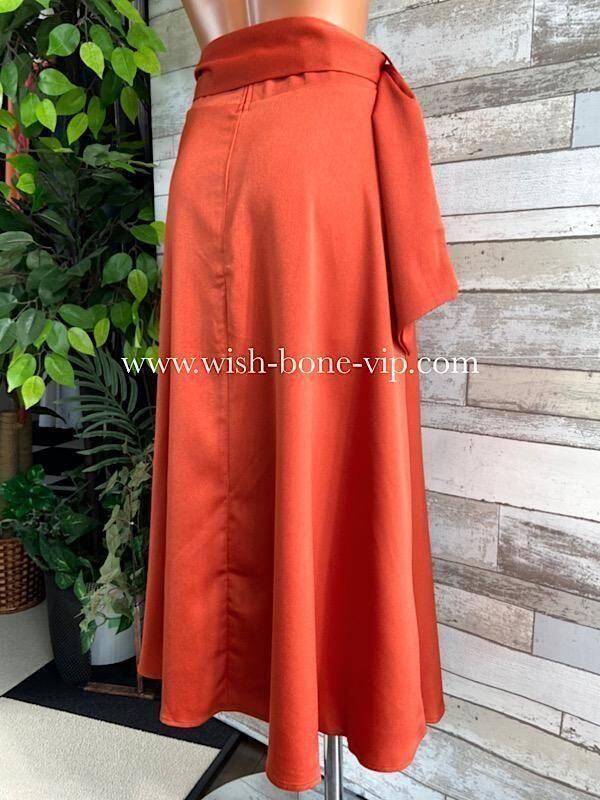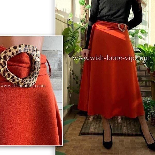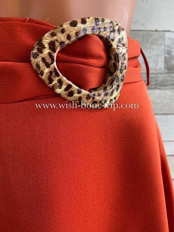 何とも言えないオレンジ系ブラウンの色合いにレオパードのワンポイント ベルトバックルがお洒落です。シルエットもとても綺麗で、ほんのりツヤとAライン、長すぎずなミディ丈、ミモレ丈が良い感じです。ショートブーツでも、ロングブーツ、もちろんパンプスでも合わせやすいデザインです。