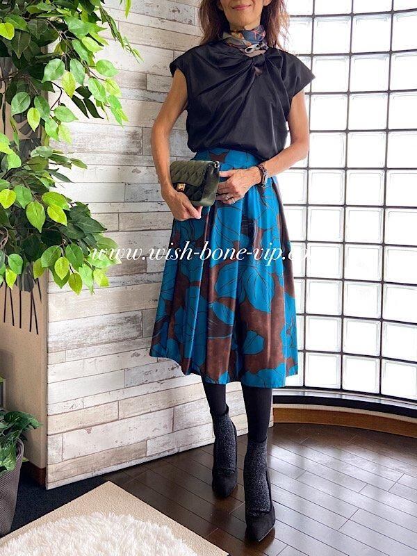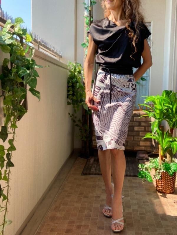ツヤがとてもきれいなトップスです。一見ツヤツヤし過ぎ?って思うのですが、それがキレイ!合わせ方でオフィス仕様やちょっとパーティーにも使えそうな便利なトップスです。デコルテのアシンメトリーや、ふんわりしているのに、太って見えないのも良いかも。少し落ちた感じのオフショルダーですので、二の腕も気になりにくいデザインです。