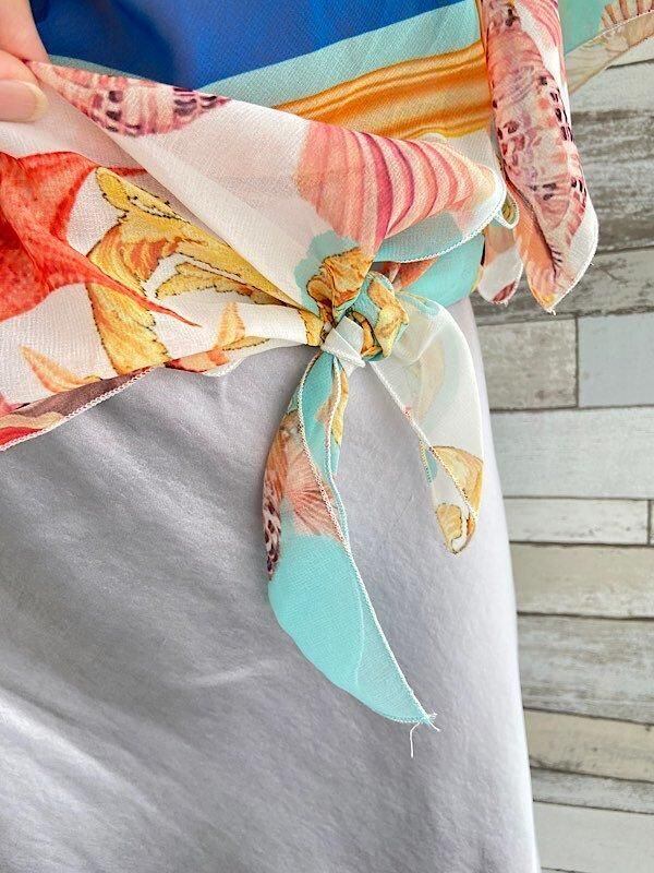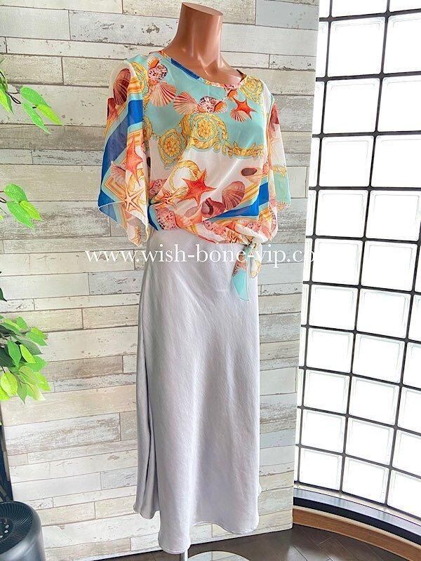軽いシフォンの様な素材にシェルなどマリンプリントがとってもステキなトップスです。鮮やかながら素材感が全体の色合いを優しく見せてくれるのも良いポイントですよ。バタフライのひらひらとしたお袖は隠したい二の腕もカバーしてくれそうです。