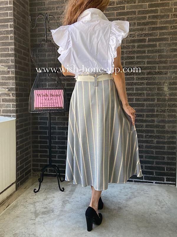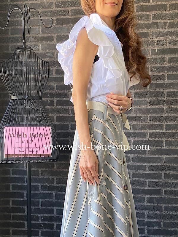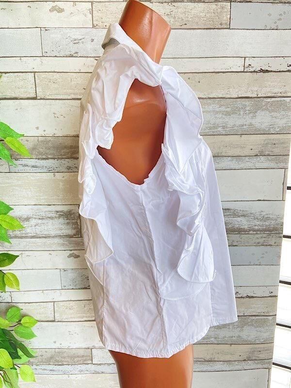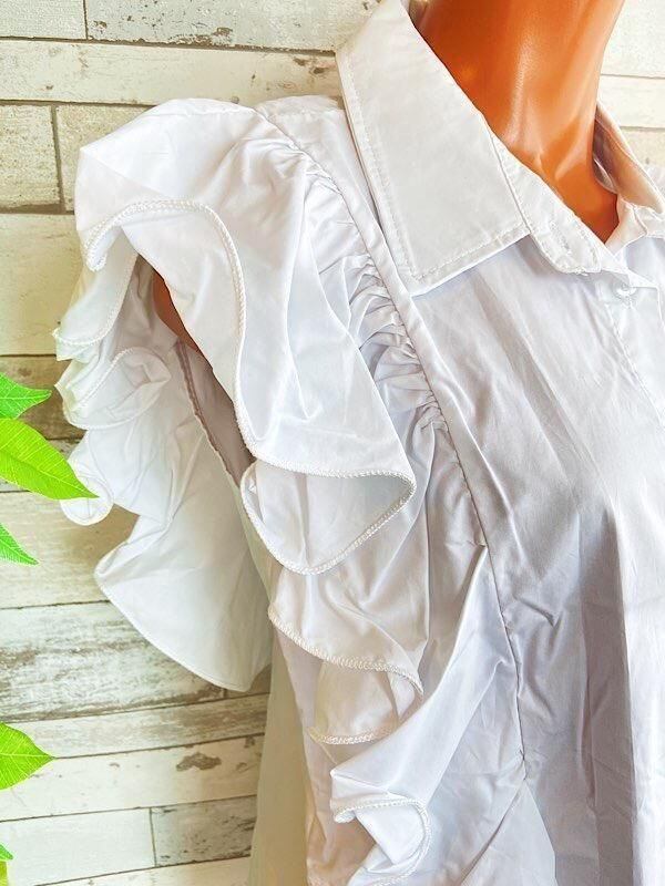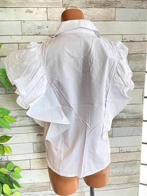 とっても素敵なフリルのシャツブラウスです。フロントの肩から背中にかけての大きなフリルも素敵です。シンプルなボトムに合わせるだけでも華やぎ夏のオシャレが楽しくなりそうですよ。