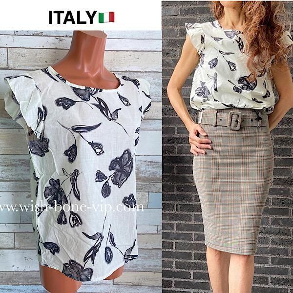イタリア製デザイントップス|Made in ITALY|フリル袖 コットン・レーヨン トップス/ブラックフラワー【アウトレットALE】