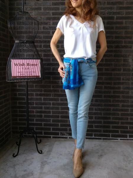 伸縮ストレッチ感がとても良いのがおすすめなイタリア製、リナシメントのスキニーデニムです。一度履くとやみつきな履き心地です!色あいも良く履き心地も良いスリムデザインです。またこちら色鮮やかなスカーフベルトもインパクト大!ロールアップやインブーツなどもおすすめです。