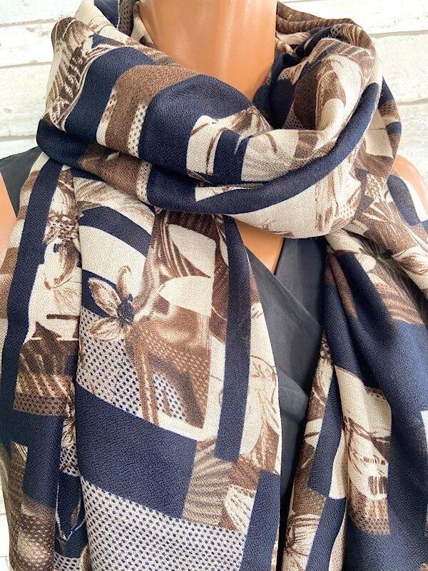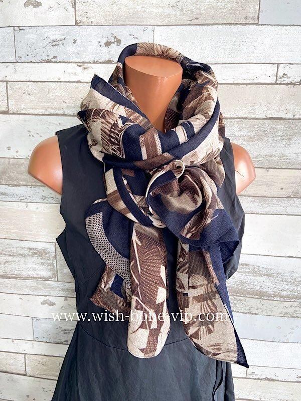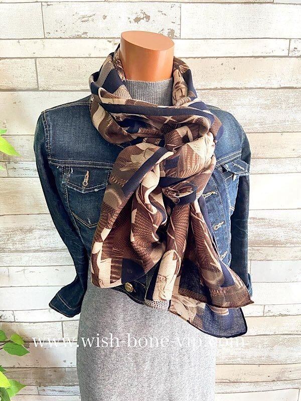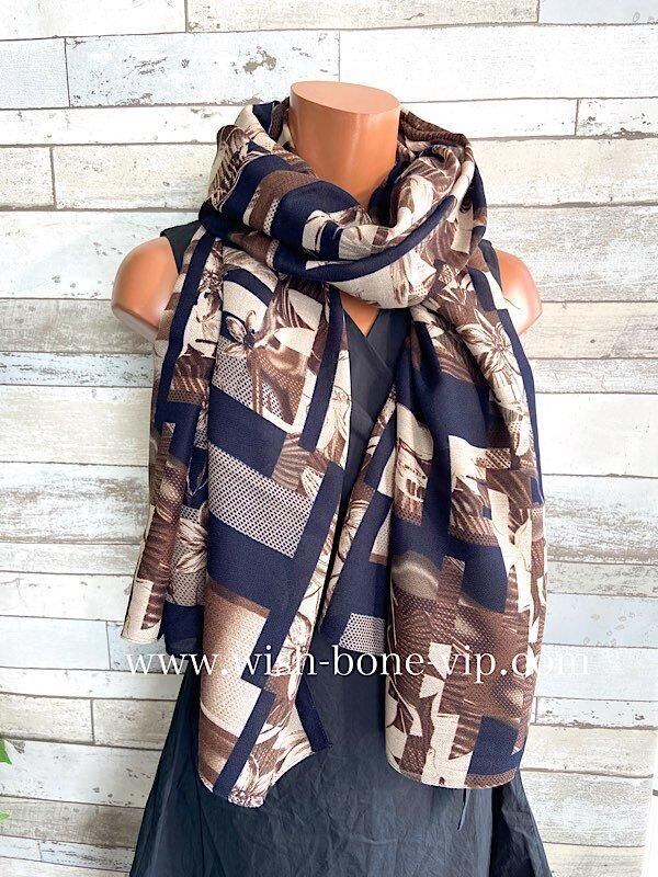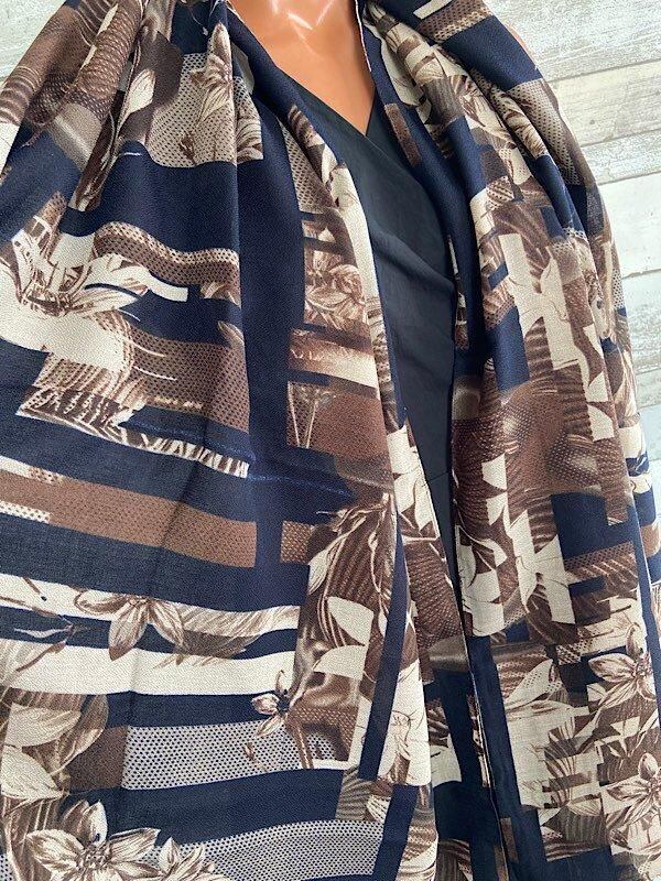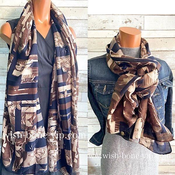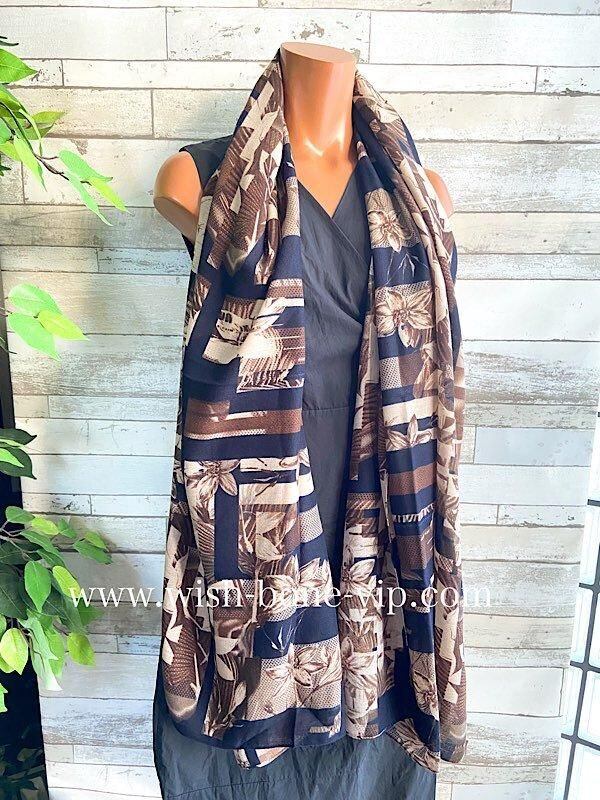 インポート 大判ストール|ロングストール・スカーフ|紫外線対策・寒暖差におしゃれストール|ブラウン&ネイビー隠れフラワー
