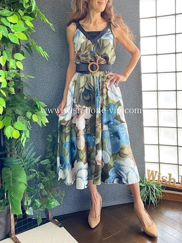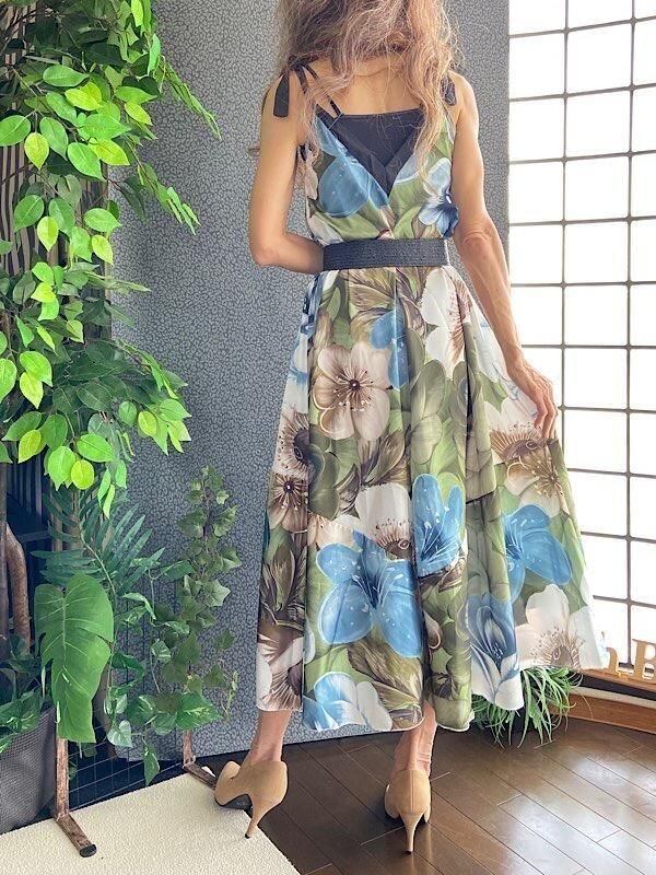 ちょっとツヤっぽい生地に独特なくすみグリーンやブルーのBIGフラワーがイタリアらしいステキなワンピースです。