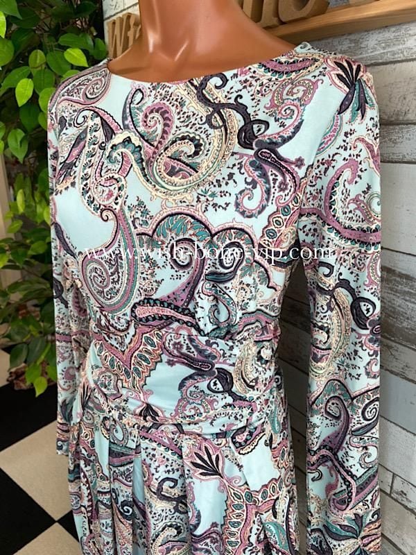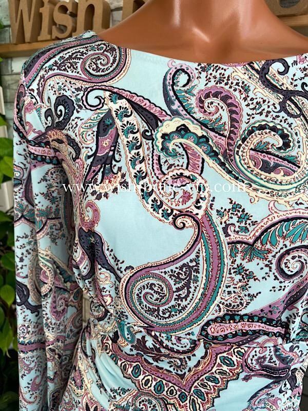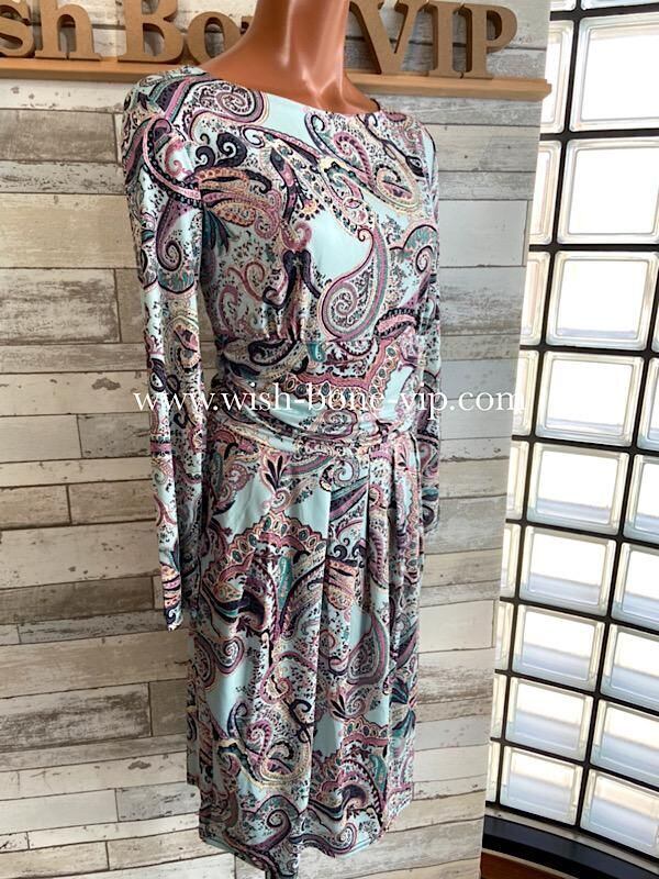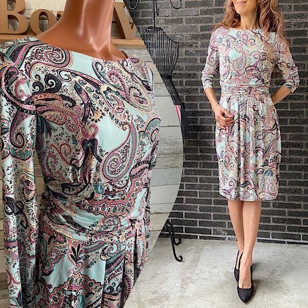 幅広のボートネックにウエストの広めのプリーツがチューリップっぽいデザイン。ウエストも幅広のドレープですのでシルエットがカッコいい系でステキ♪Aラインが苦手。タイトじゃピチピチ過ぎる。でもダルダルのワンピースは嫌な方に嬉しいデザインです。上半身は生地が二重になってるのでインナーラインも響きにくそうです。