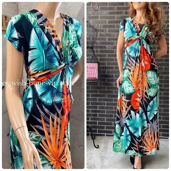 フランス製インポートロング・マキシワンピース|FIFILLES de PARIS フィフィーユ・パリ|ジャージ・ストレッチワンピース/ブルー&オレンジボタニカル(T2)