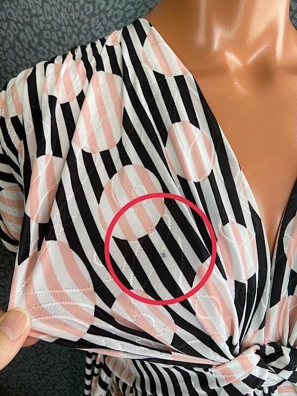 着用では分からないぐらいの点の様な汚れが胸元のプリーツ部分を広げると確認出来ましたので、少しアウトレット商品でお値引き販売させて頂きます。写真にてご確認ください。
