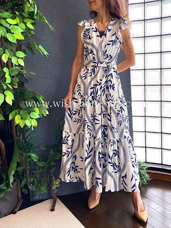 とっても爽やか!春夏に着たいロング・マキシワンピースです。ホワイトベースにネイビーの葉っぱのようなプリントとお袖のデザインがステキ!たっぷりな長さも優雅ですよ。