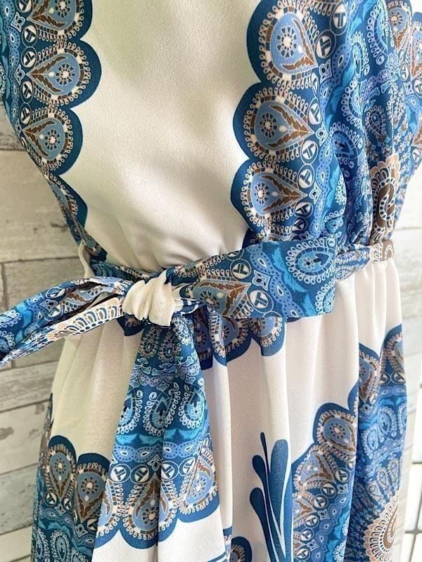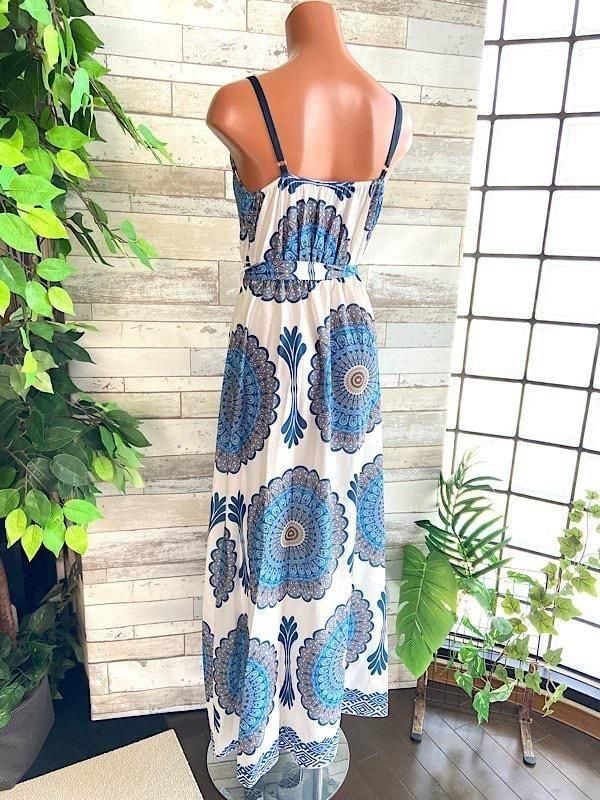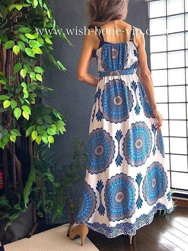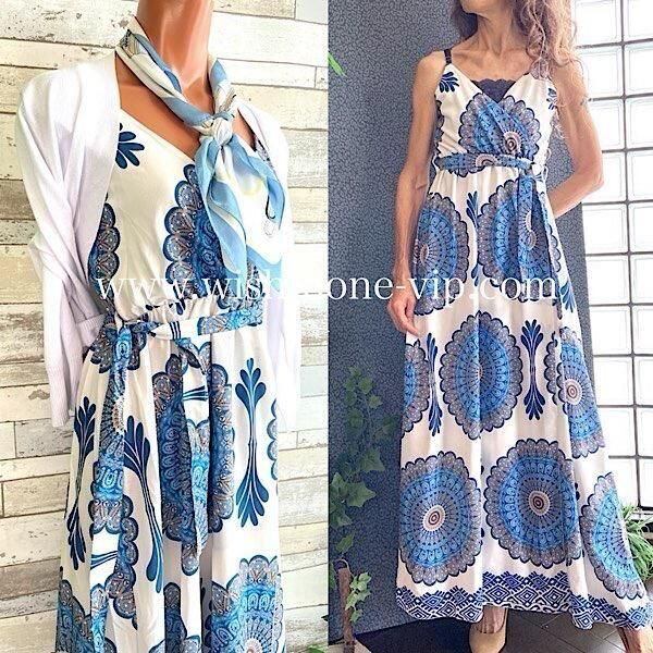 ブルーの万華鏡のようなプリントがとっても爽やか!夏に着たいロング丈マキシワンピースですよ。テカリのないサラッとした質感も涼しそうですよ!