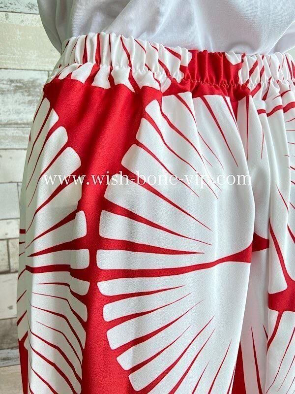 ホワイトベースにレッドのアートな模様が春夏のお出かけを楽しくしてくれそうなワンピース風セットアップです。