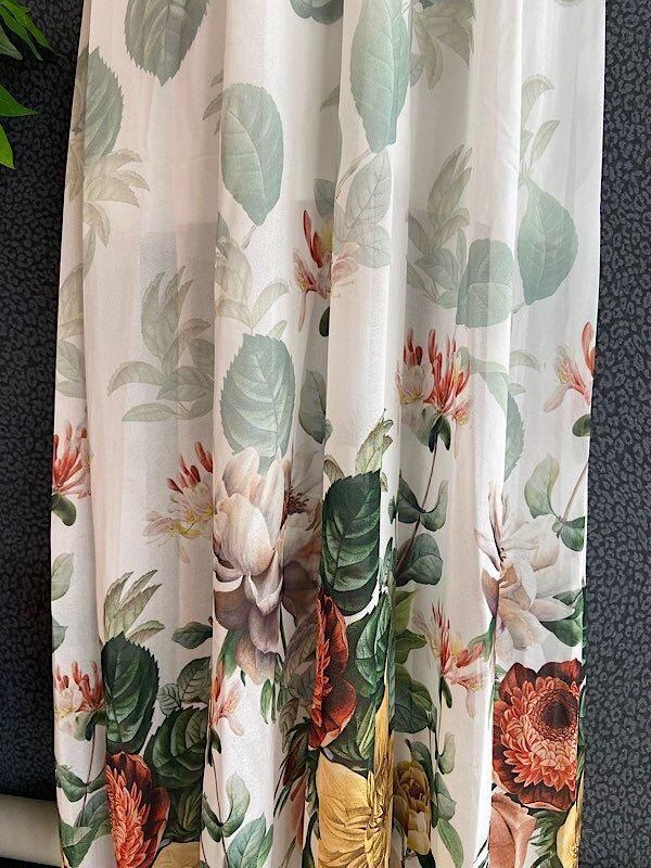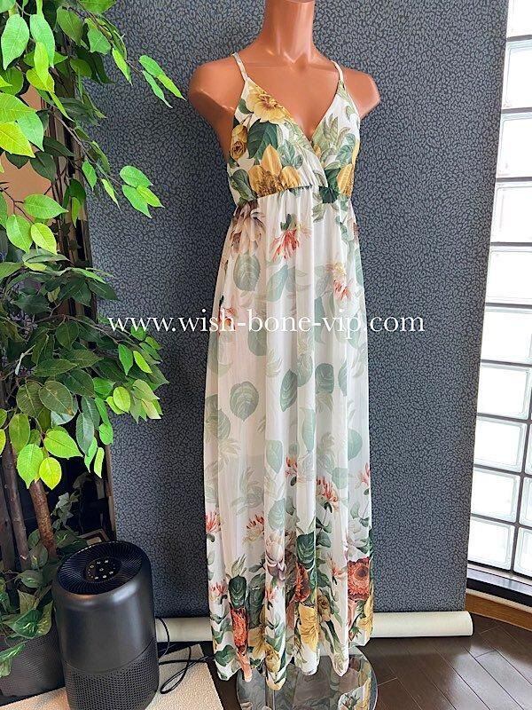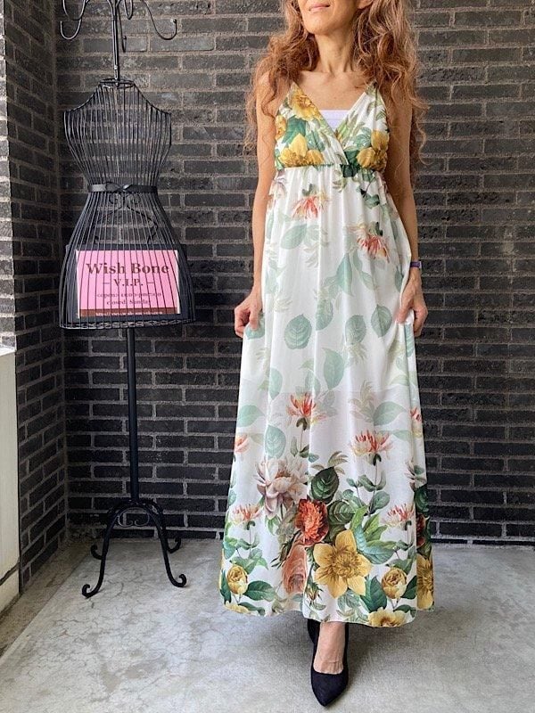 背が高い方にも満足いただける長さとたっぷり広がるAラインがとても素敵な、ロング丈マキシワンピースです。涼し気なシフォンの様な素材に、グリーンやイエローのフラワー、ボタニカルがステキで上品なマダムになりそうです。中にTシャツやキャミソールなどを合わせても良いかも!デニムを羽織ってお出かけしたくなるようなワンピースです。