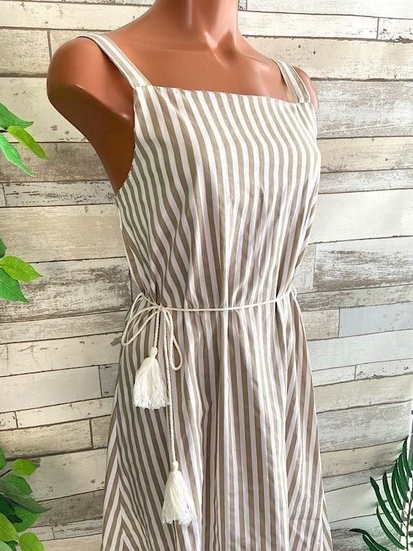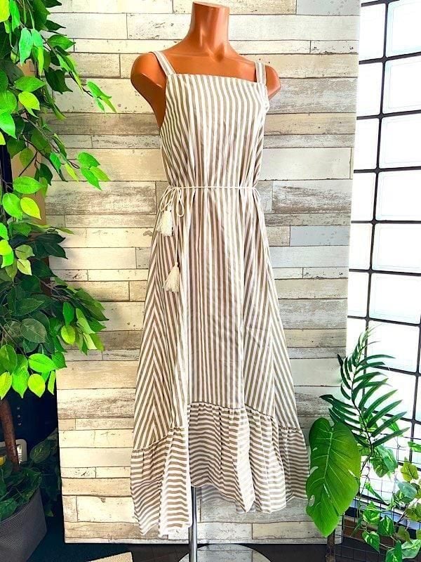 イタリア製ロング・マキシワンピース|Made in ITALY|コットンストレッチ・ストライプ&ボーダー・裾アシンメトリー|ロング丈マキシドレス/ベージュ(Free)