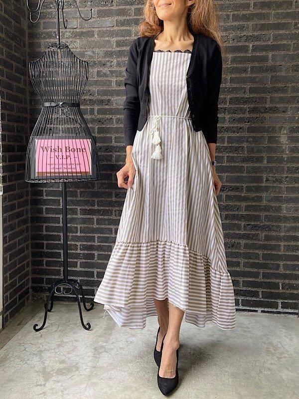 ストライプと裾のボーダーの切り替えがお洒落な、アシンメトリーのロング丈マキシワンピースです。中にTシャツやフレンチスリーブなどをあわせても良いかも♪