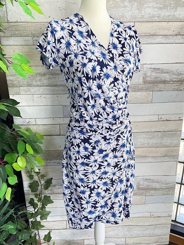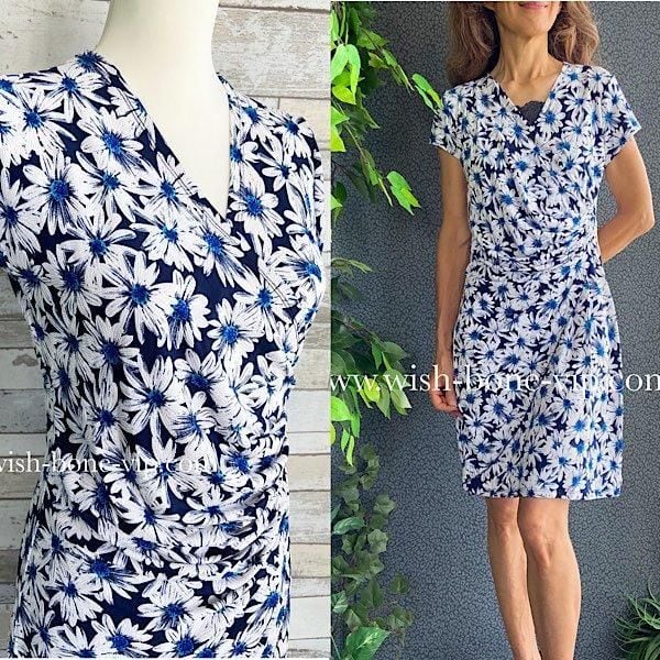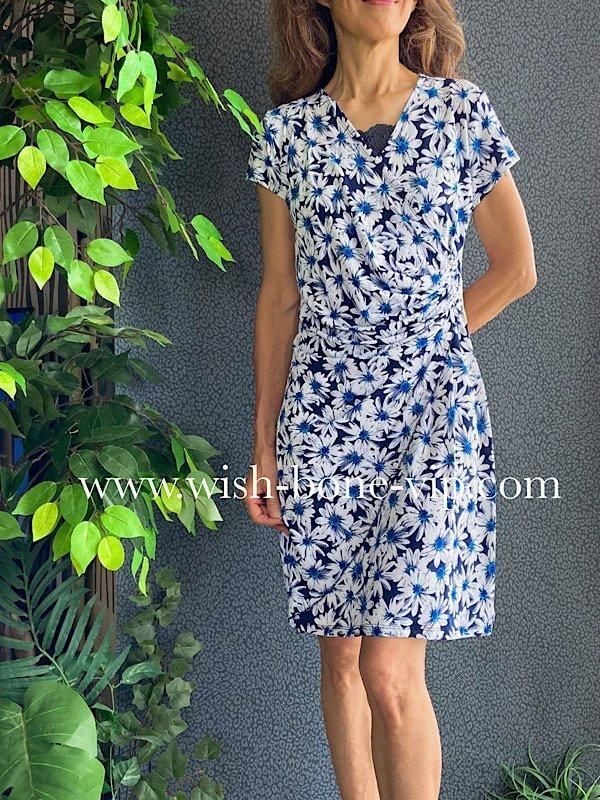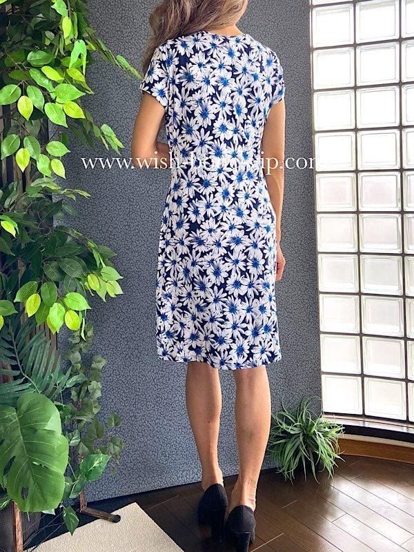 フランス製インポートワンピース|カシュクールワンピース/立体ワッフル・ホワイト&ブルーフラワー(L)