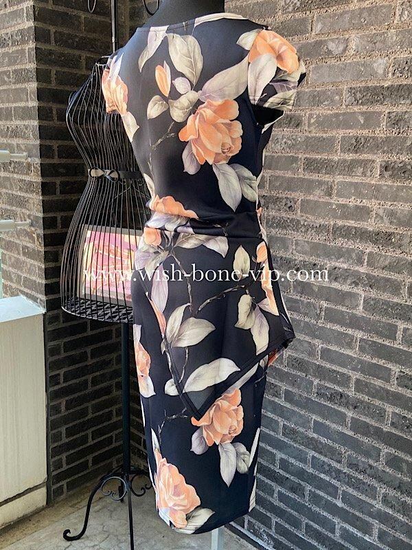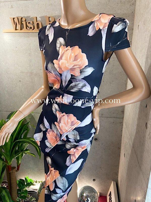 淡いピンク&グレーのフラワーがブラックベースにとても上品なプリントのタイトワンピースです。切り替えのデザインや裾のちょっとしたカットも素敵でカッコいいワンピースです。