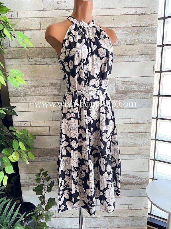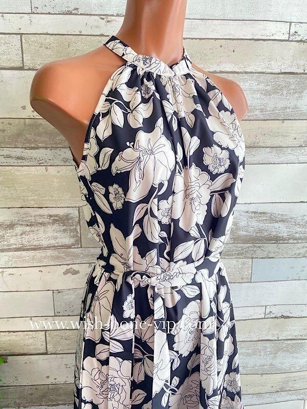 SALE UKイギリスインポート ホルターネック&ティアード インポート ロング丈・ミモレワンピース/ブラック&ホワイト フラワープリント