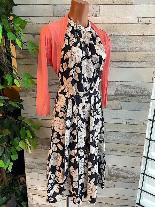 ブラック&ホワイトにフラワーがステキなティアード、ホルターネックのワンピースです。足元への生地が多いので動くたびにゆらゆら気分上がりますよ~。ジャケットオン!で爽やかな春夏のお出かけにいかがかしら。