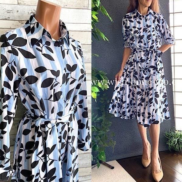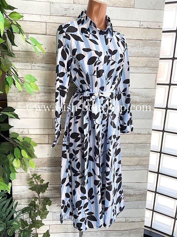 インポート長袖シャツワンピース|ホワイト&ブルーストライプ 膝丈・ミモレワンピース/ブルー&ブラックリーフ