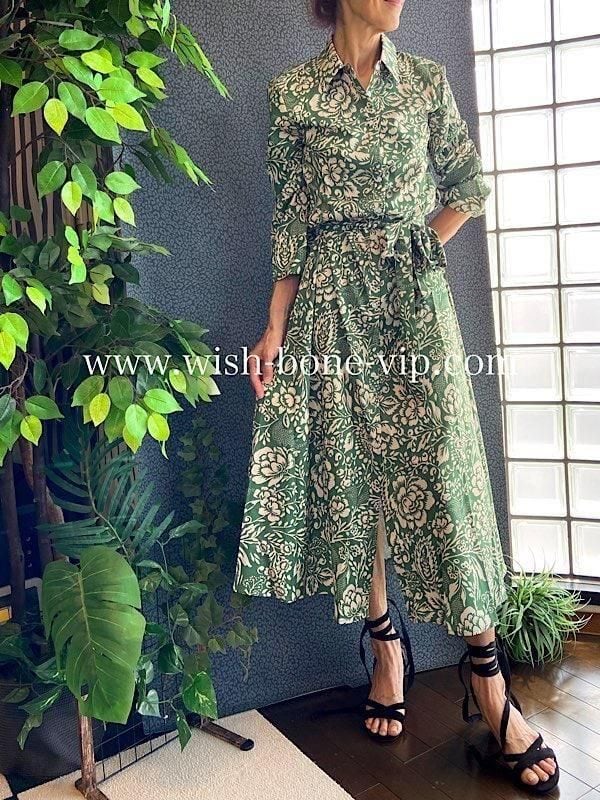 インポート長袖シャツワンピース|ロング・マキシワンピース|シックなグリーン系ワンピース