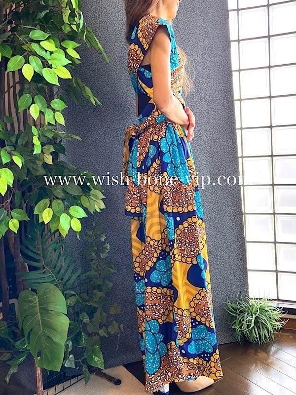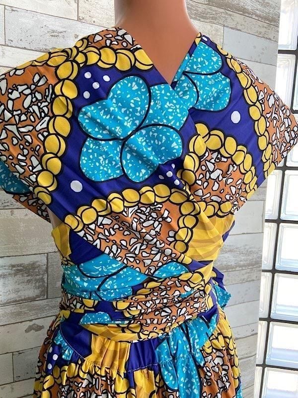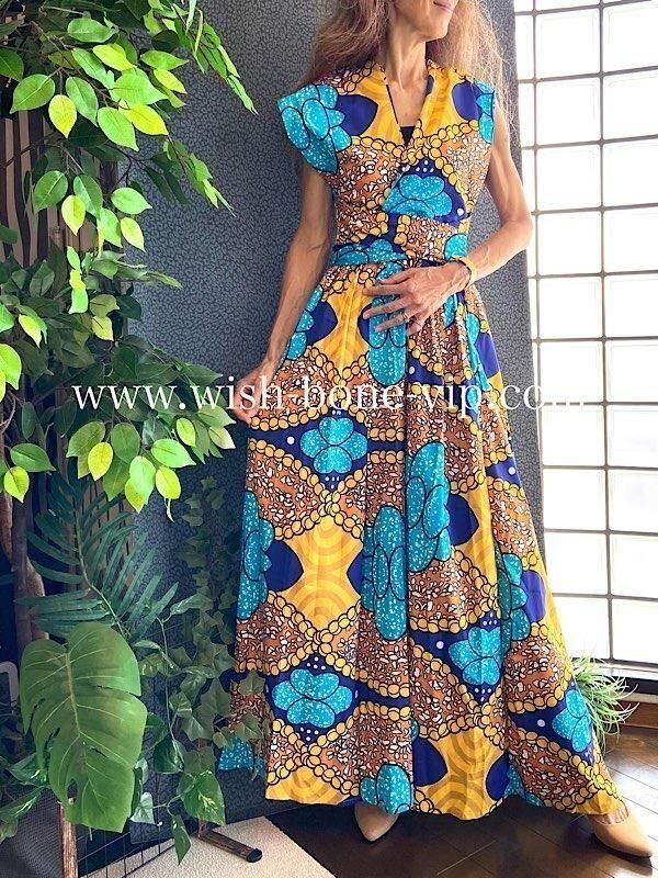 USAインポート アフリカンプリント ロングドレス|アレンジ次第なマキシワンピース|ビビットなビタミンカラー/ブルー&イエロー