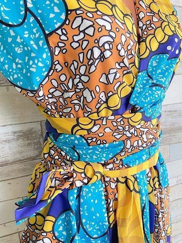 大きめデザインですが、上部は生地を背中でクロスしたり、首にかけてホルターネックのように着たりと、アレンジが効くデザインです。まさにアフリカンなワンピース!衣装やイベントに最高!!なのではないでしょうか。色合いもビビットで間違いなく目を引きます。丈もたっぷりな長さです。ご参考までにモデル画像は中にキャミを着ていますので、その黒がチラ見えしています。