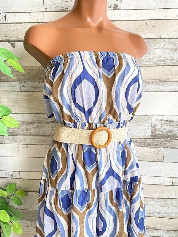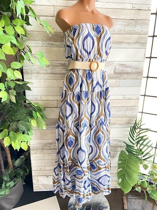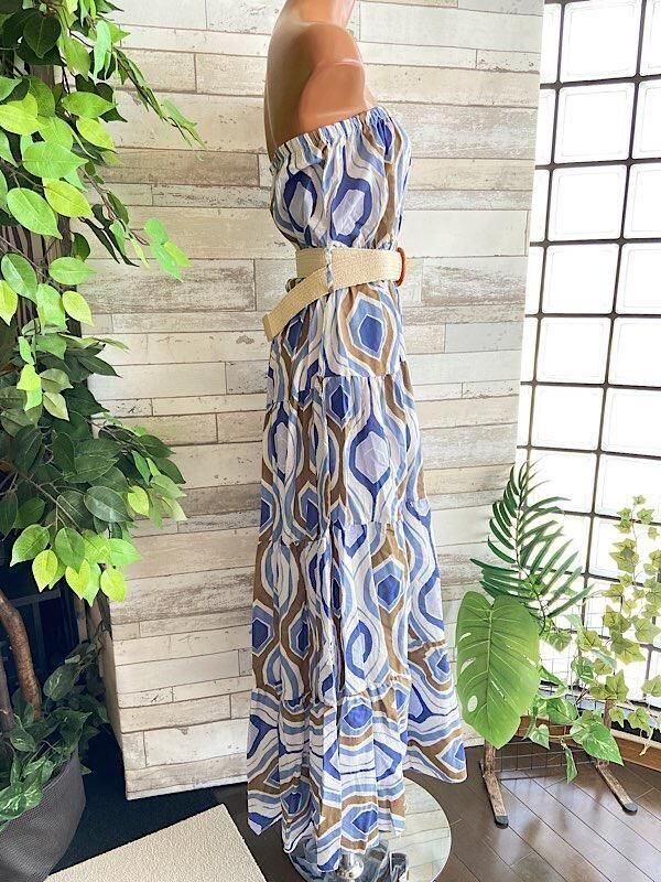 イタリア製インポート マキシドレス・ロングワンピース|Made in ITALY| コットン100% ベアトップワンピース(ベルト付き)/ブルー(Free)