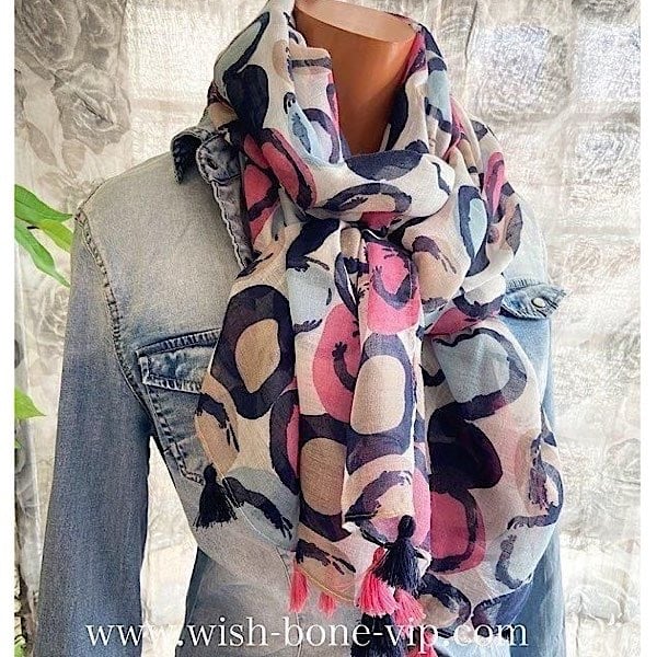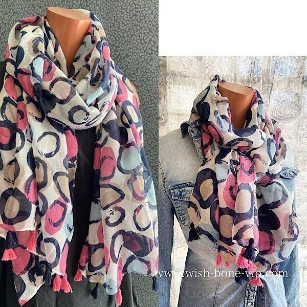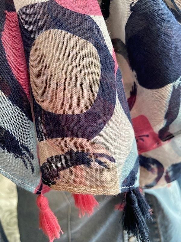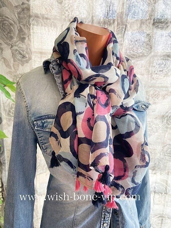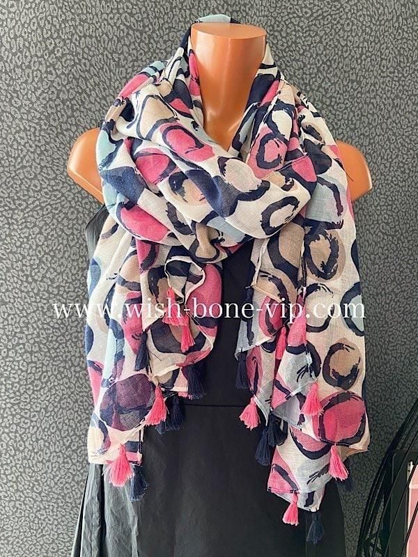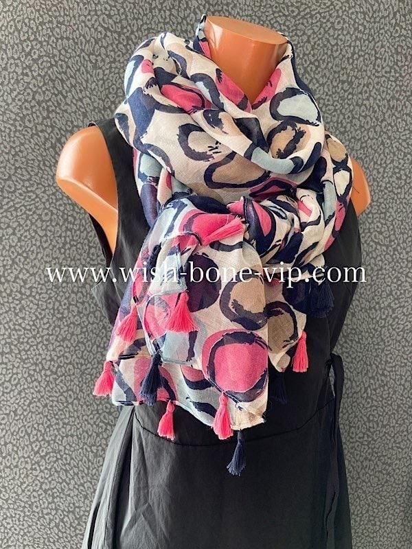 イタリアインポート大判ロング・ストール|滑らかロングスカーフ/POPアート・ピンク&ネイビー タッセル