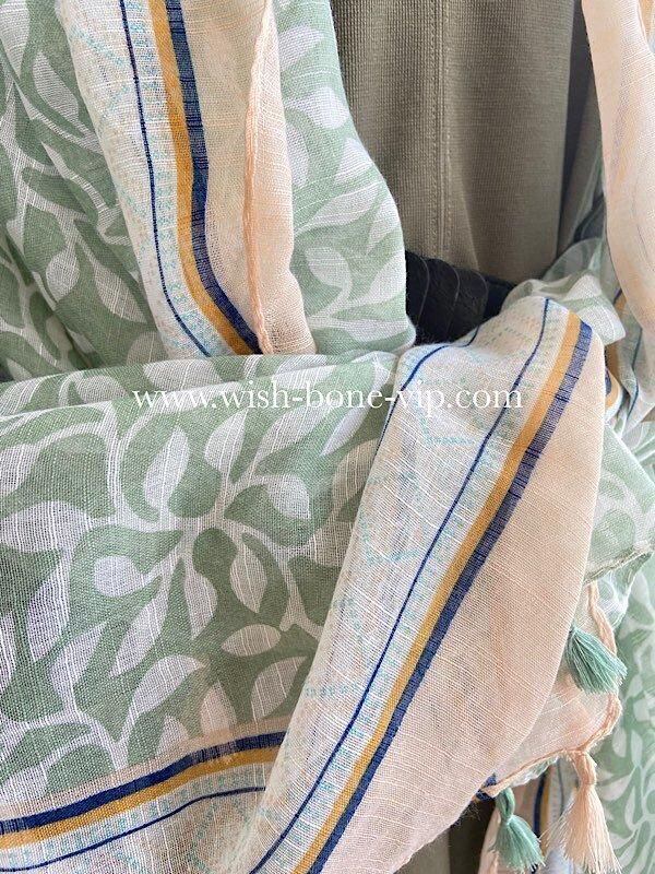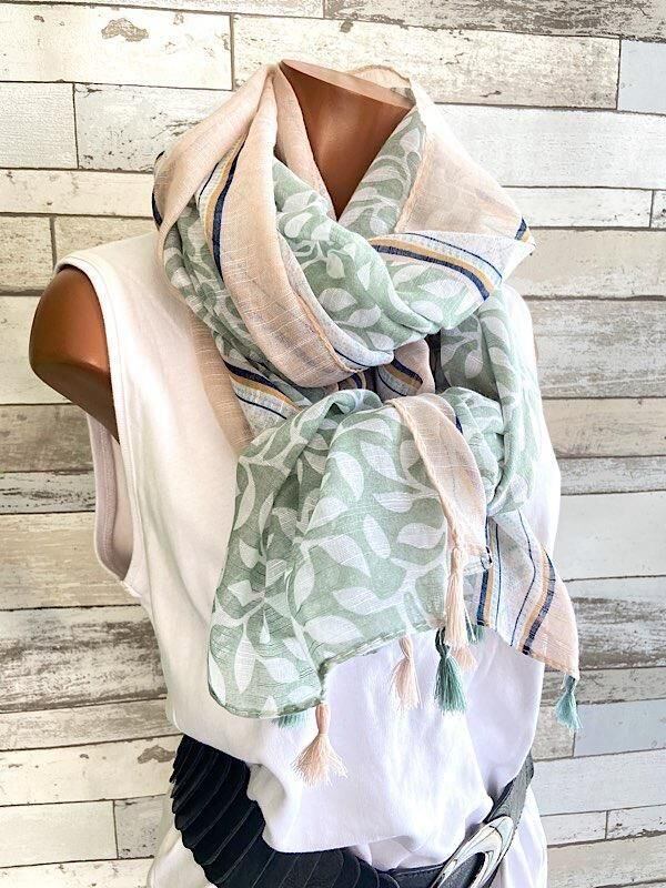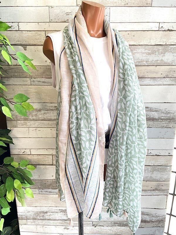 【アウトレットSALE】 【イタリアインポート】大判ロング・ストール|滑らかロングスカーフ/リーフ風モスグリーン・タッセル