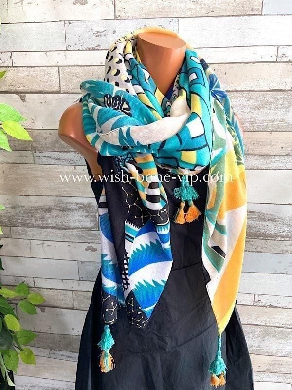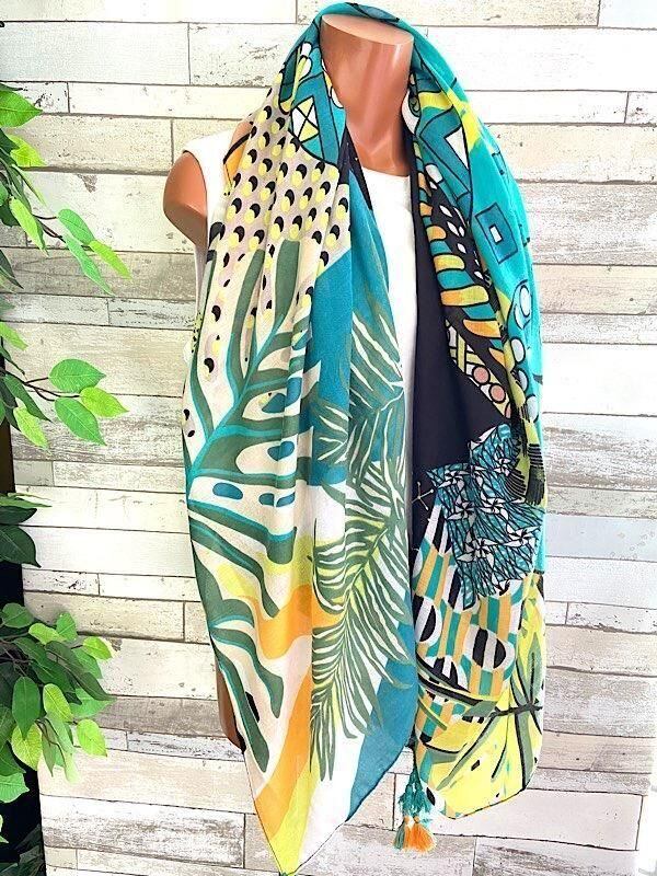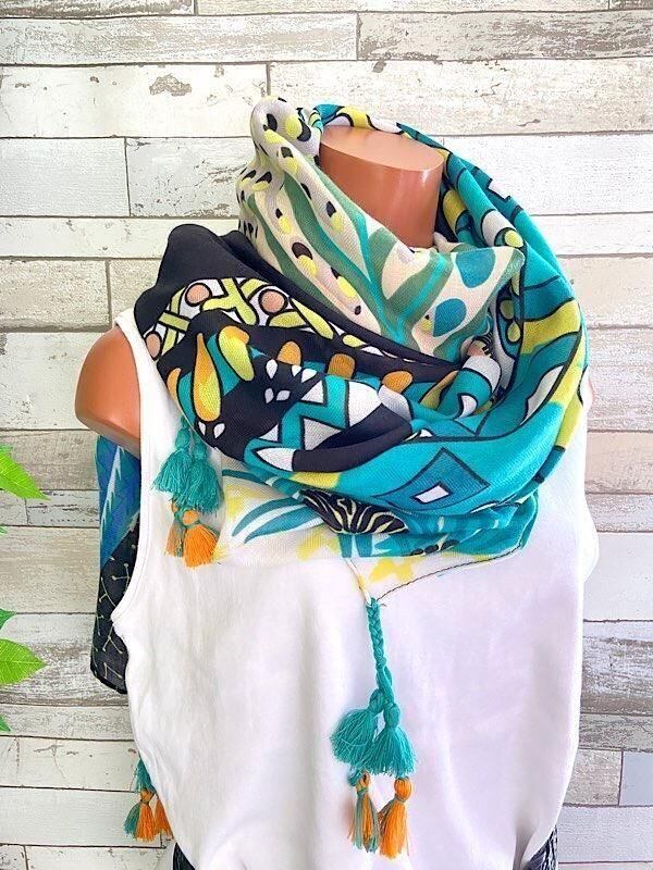 フランスインポート大判ストール・スクエア調タッセル付き ポリエステル ストール・スカーフ|アフリカンプリント GIRL/グリーン系