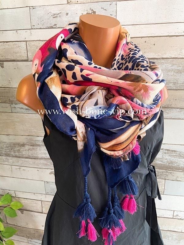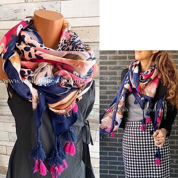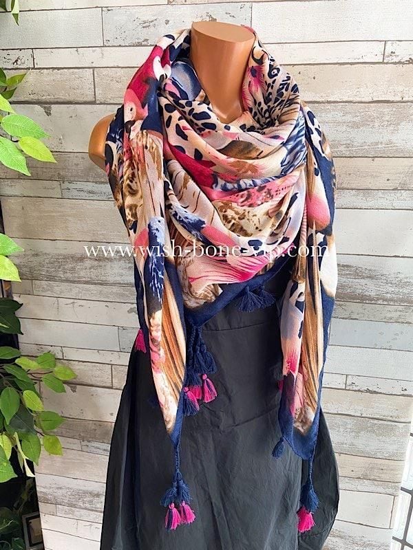 フランスインポート大判ストール・スクエア調タッセル付き ポリエステル ストール・スカーフ|バードフラワー/ピンクネイビー
