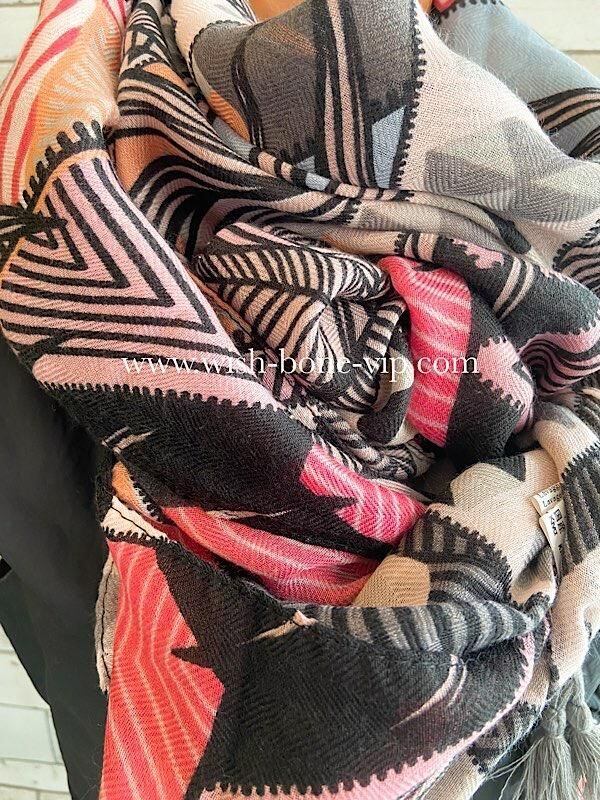 フランスインポート大判ストール・スクエア調タッセル付き ポリエステル ストール・スカーフ|幾何学/ピンクグレー