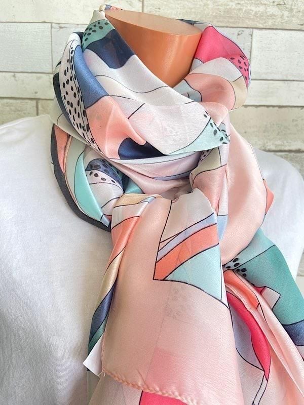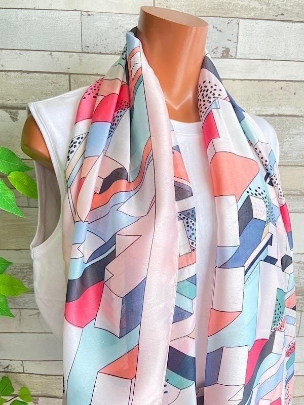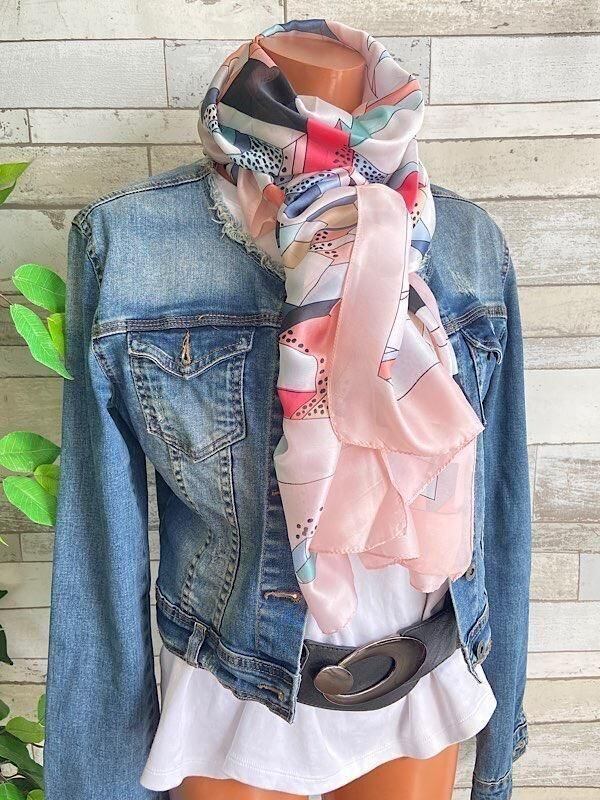 なめらかで程よいツヤっぽさがキレイめコーデに映えるかなり大判のスカーフです。サラッとしているので巻きやすく、垂らしてるだけでもオシャレですよ。Tシャツやデニムとの相性の良さそうな色柄です。