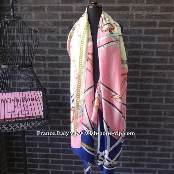 フランスインポート 大判&ロングストール|190x90cm / Silk シルク&ビスコース | ツヤ系スカーフ/ピンク&ネイビー